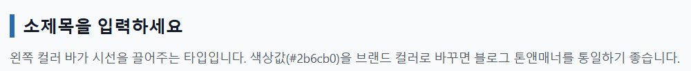 <h2 style="margin:24px 0 12px; padding-left:10px; border-left:6px solid #2b6cb0; font-size:1.25rem; font-weight:800;"> 소제목을 입력하세요 </h2>