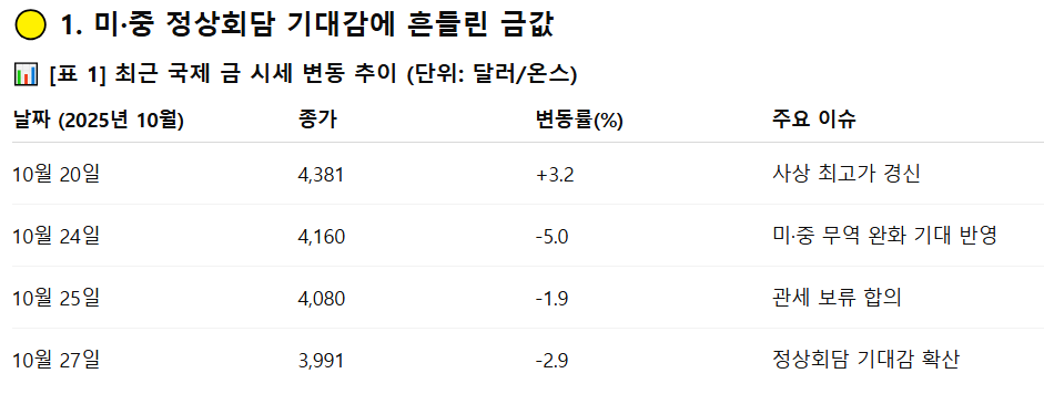 국제 금값이 온스당 4,000달러선을 내주며 일주일 새 9% 이상 하락했습니다. 미·중 정상회담을 앞두고 무역 갈등 완화 기대가 확산되면서, 안전자산 수요가 다소 약화된 영향입니다. 미국의 추가관세 보류, 중국의 희토류 통제 유예 등 긍정적 신호가 나오자 단기 차익 실현 매물이 늘었습니다. 시장은 이번 조정을 ‘거품 해소 과정’으로 보며, 과열된 포지션 정리 후 재상승을 위한 숨 고르기로 평가합니다.